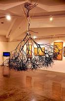 - Current conceptual focus on nature-human habitat, environment and climate change, materials include waste material & found objects